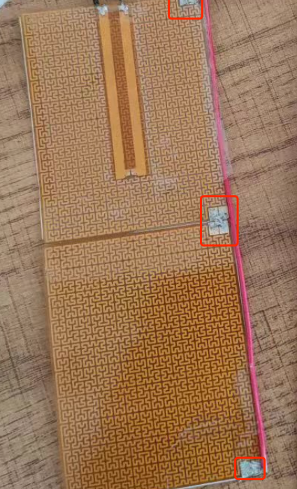 4、发热材料:通过制作的fpc作为发热材料。使用希尔伯特曲线布线。考虑实际温度只需要在41度以下,所以未做PD诱骗等设计,一般插在电脑上,电压5V电流1A左右。fpc单面是10欧姆左右,可以根据自己电源情况,连接组合。我采用上下两面并联,然后两张串联,最终单只脚10欧姆,两只脚同时加热时是5欧姆,满足电脑输出的5V1A条件。