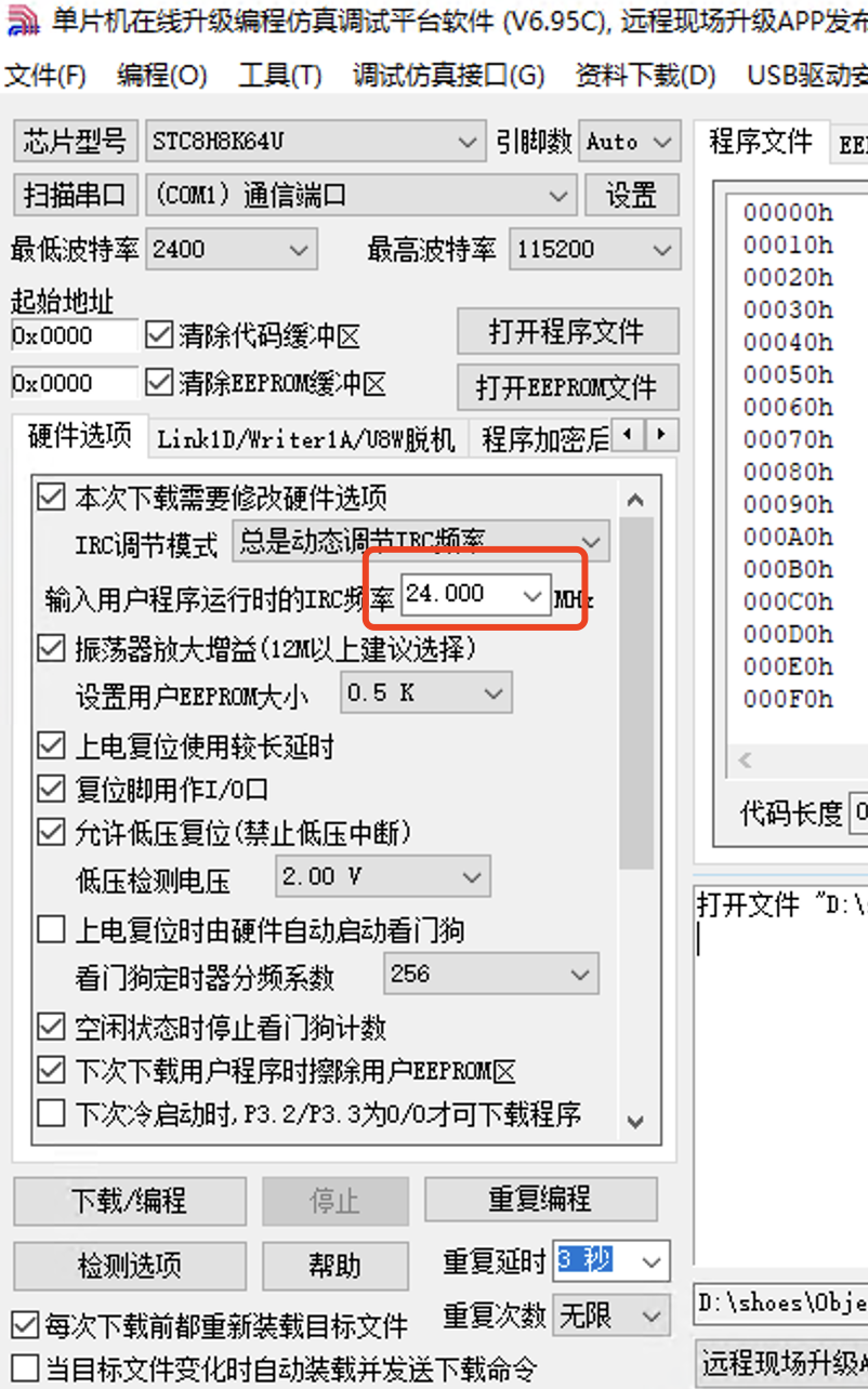 4、在下载软件中,选择程序文件,选择频率为24MHz。
