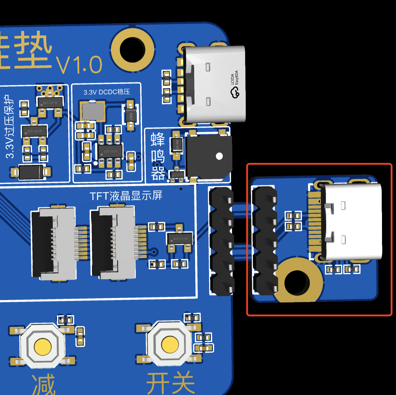 如图,电路板一共设计了两个usb插座,上边的是平时供电使用。红框内的为烧录使用,这样设计,主要是因为将供电和下载使用一个usb时,经常会出现无法正确进入下载模式的情况。让新手不只所措。