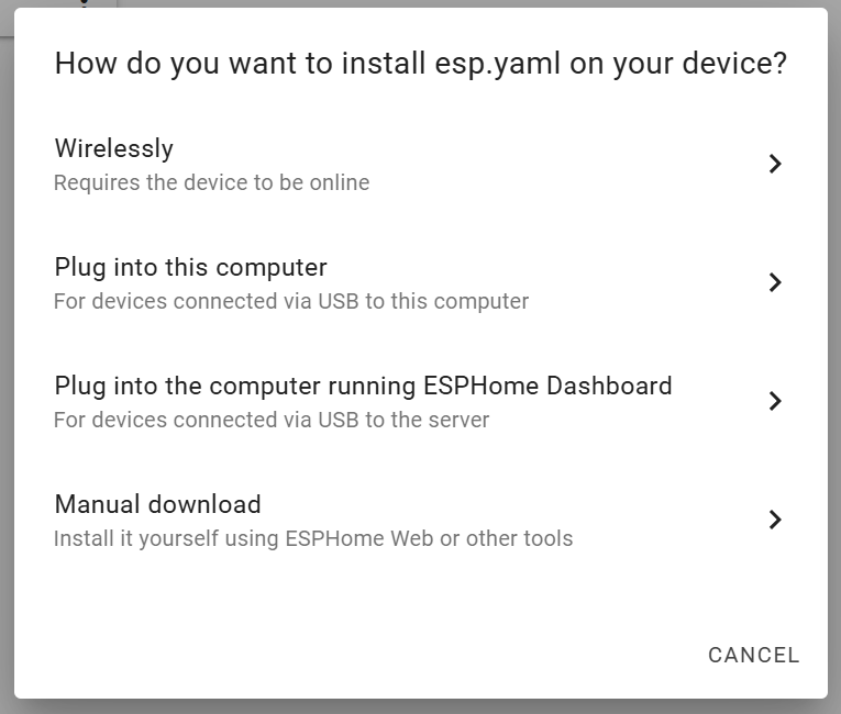 可以将立创开发板接到电脑上(选项二)也可以接到HA设备的USB接口上(选项三),我在电脑上安装有一点问题,就在HA设备上安装了