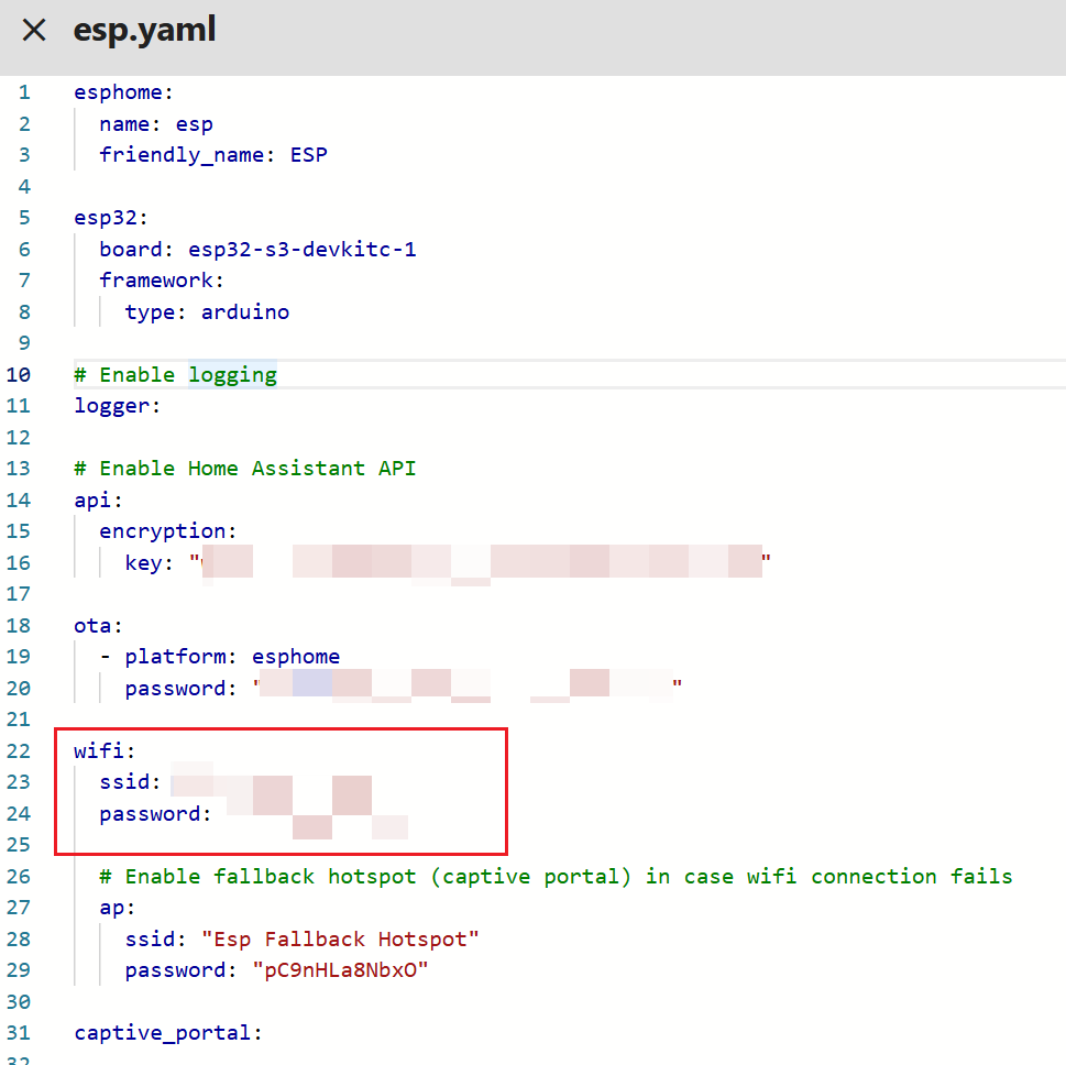 在yaml配置文件中,特别注意Wifi配置正确的名称和密码,然后进行保存烧入文件,