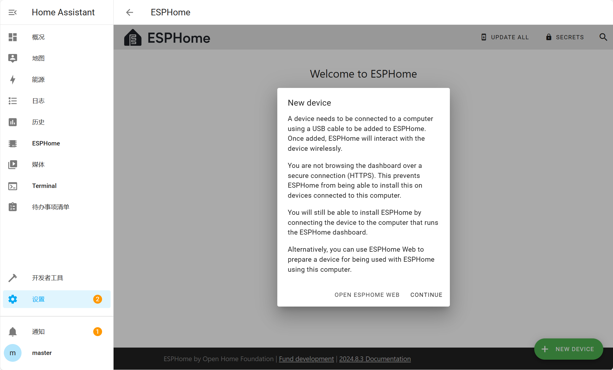 进入ESPHome界面,点击添加设备(NEW DEVICE),选择Continue