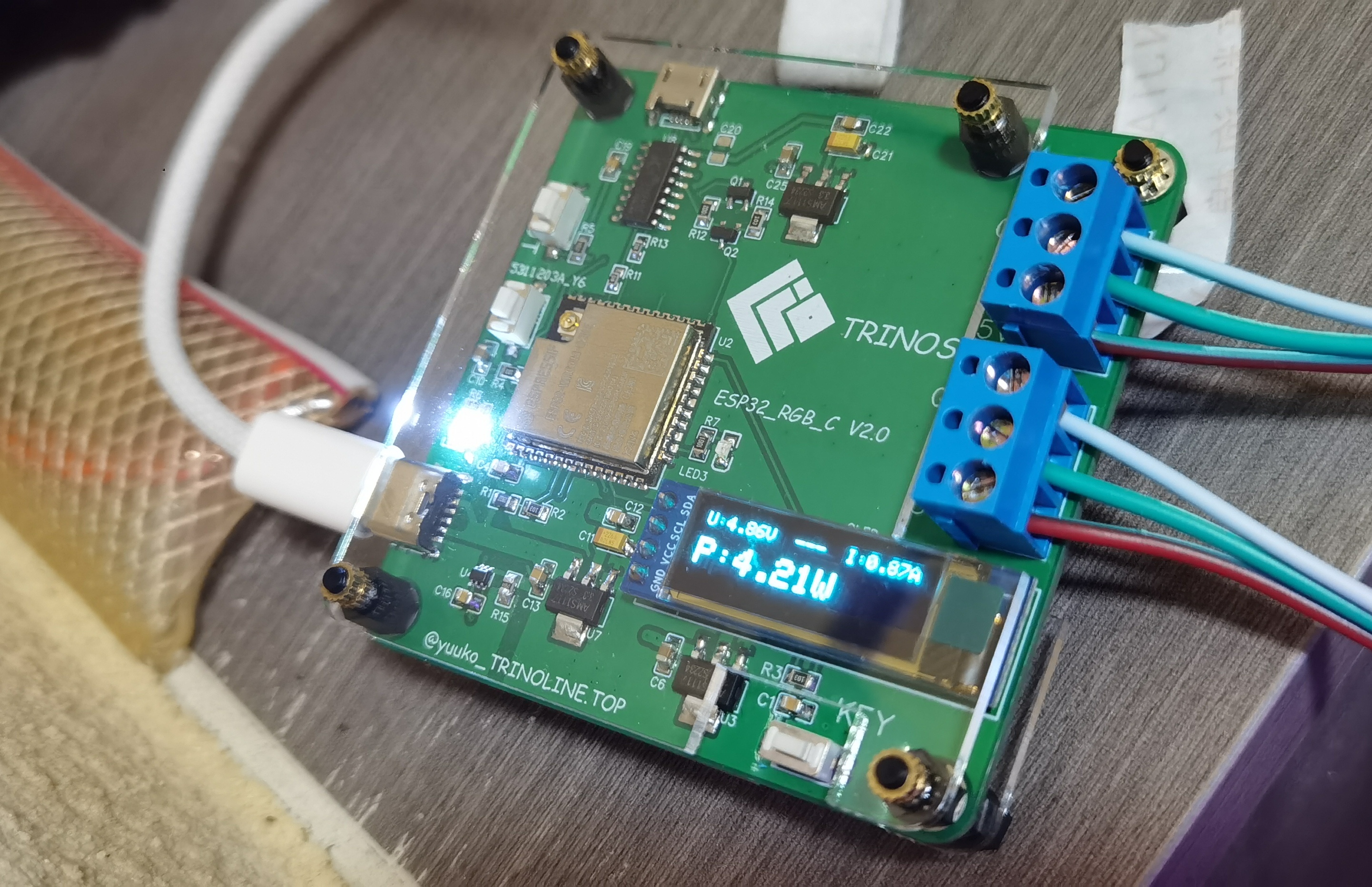 其实没啥好说的,低创产品,就是基于ESP32的RGB控制器,还只能驱动两条5V的WS2812灯带,带比较粗糙的电流采样和电压采样和OLED以显示功率,ADC也完全没有滤波算法,想着测个大概不超功率就差不多得了(ESP32饱受诟病的非线性ADC误差也真的大)。