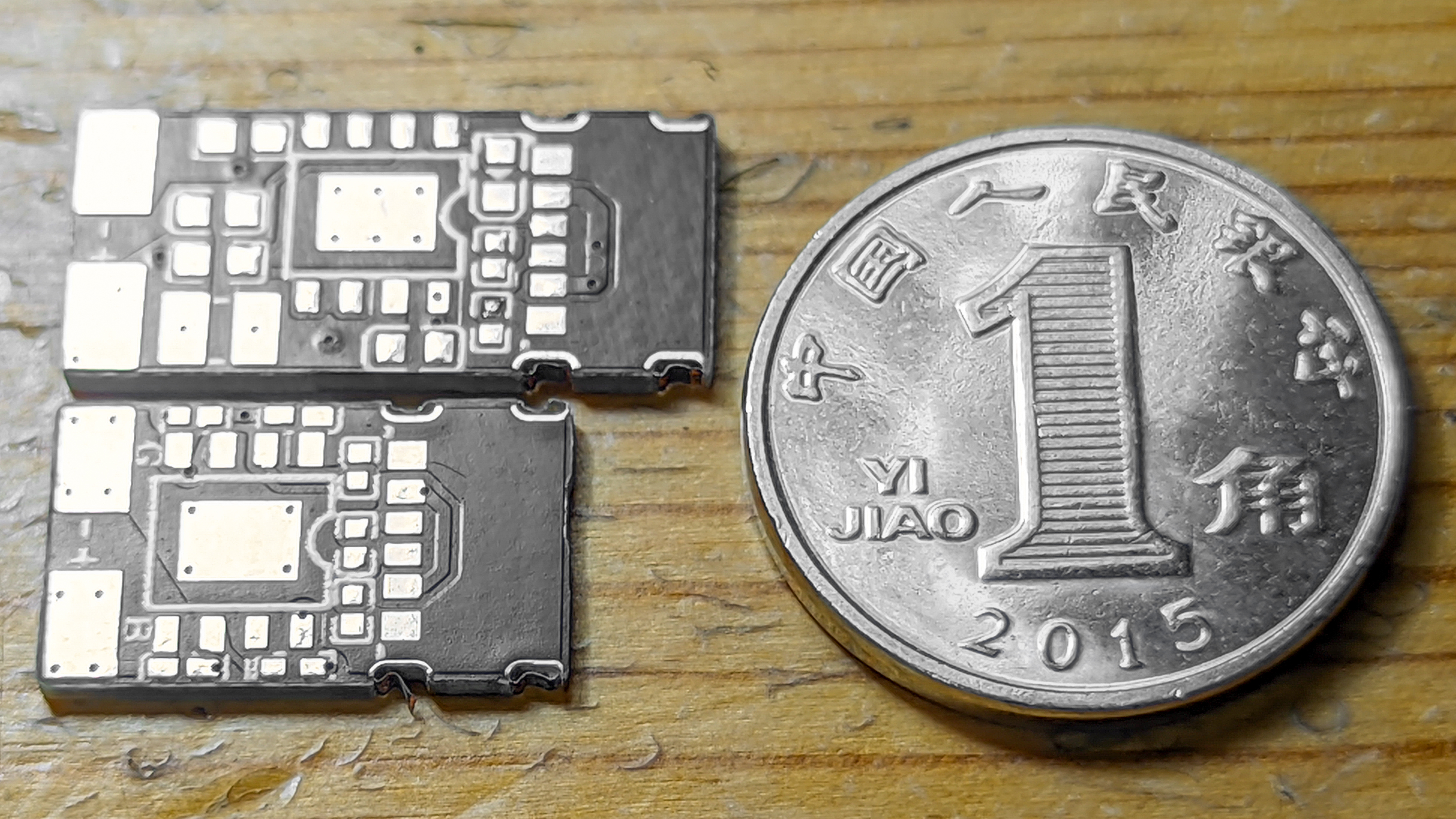 此模块没有追求极限体积。双面板尺寸可以更小,但为了方便焊接都在元件单面,电阻电容大部分都是0603。如果做半孔宽度可以减少到9mm,不过不能免费打板,目前是10mm宽