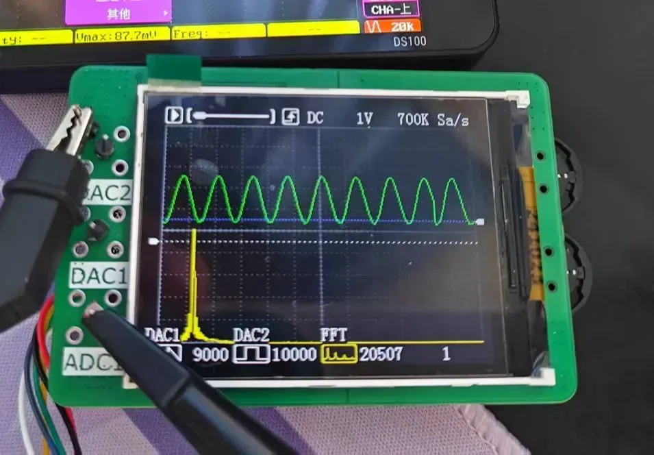 4.支持1-50kHz任意波形信号(手上只有这种)输入,识别。采样率最高可以突破1M,但为了不影响稳定性,最终选择单通道ADC采样700k,如果使用多通道同步采样可以更快。