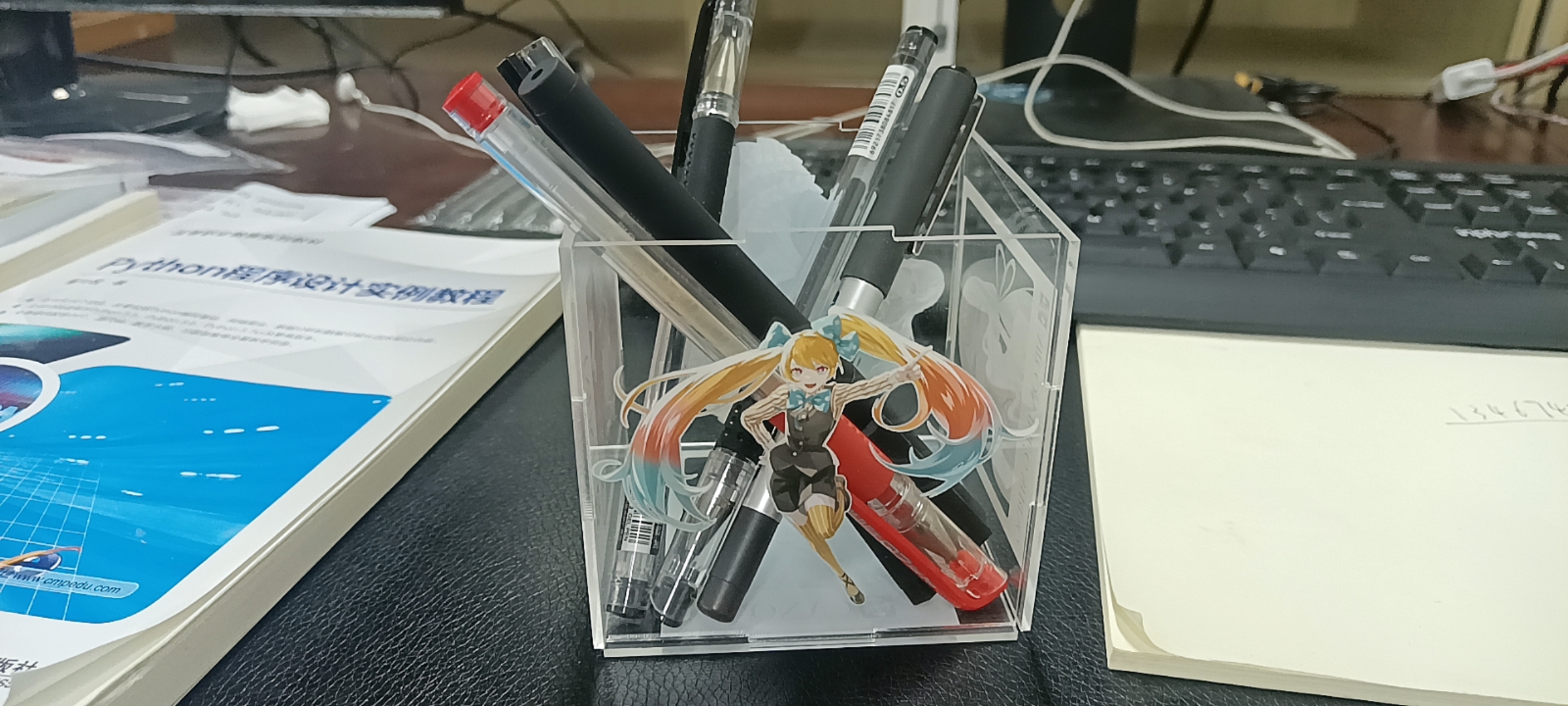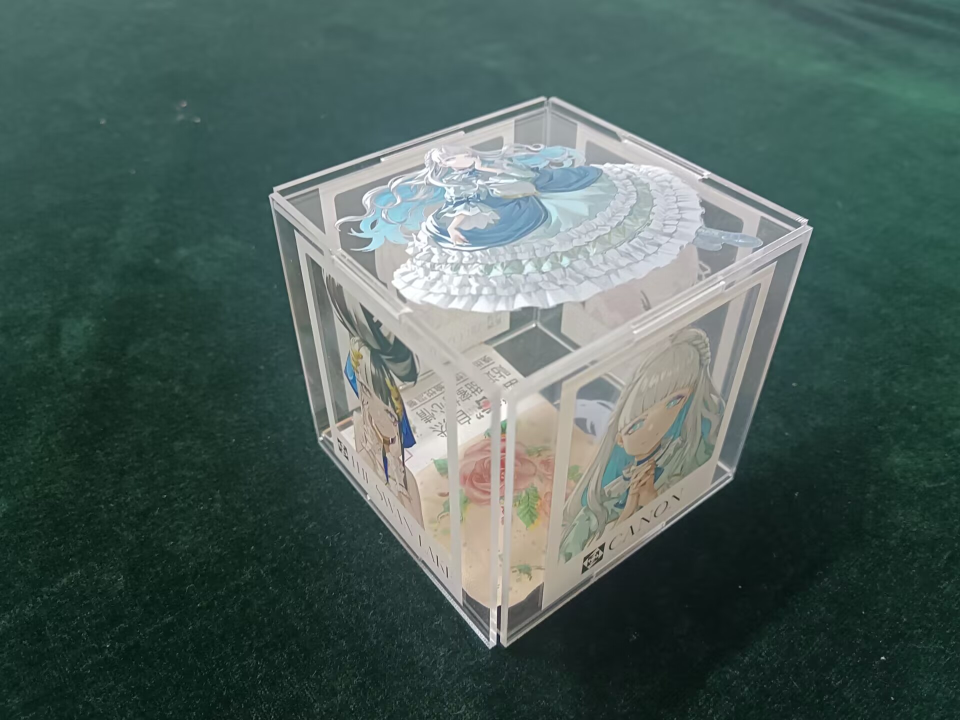 为纪念《宿命回响:向上的叹息》游戏国服开服半周年而制作的一个亚克力的立方体,每一面都有不同的奏者(角色),可作为一个摆件,去掉一面就是一个笔筒。