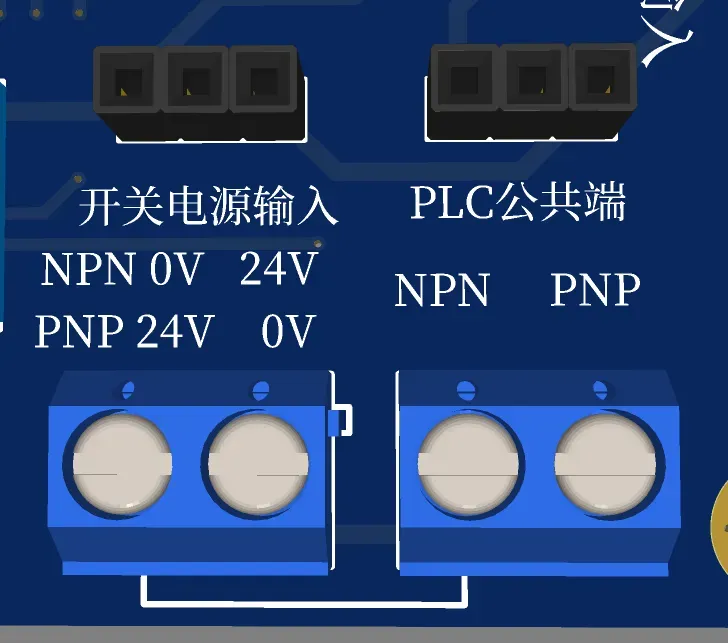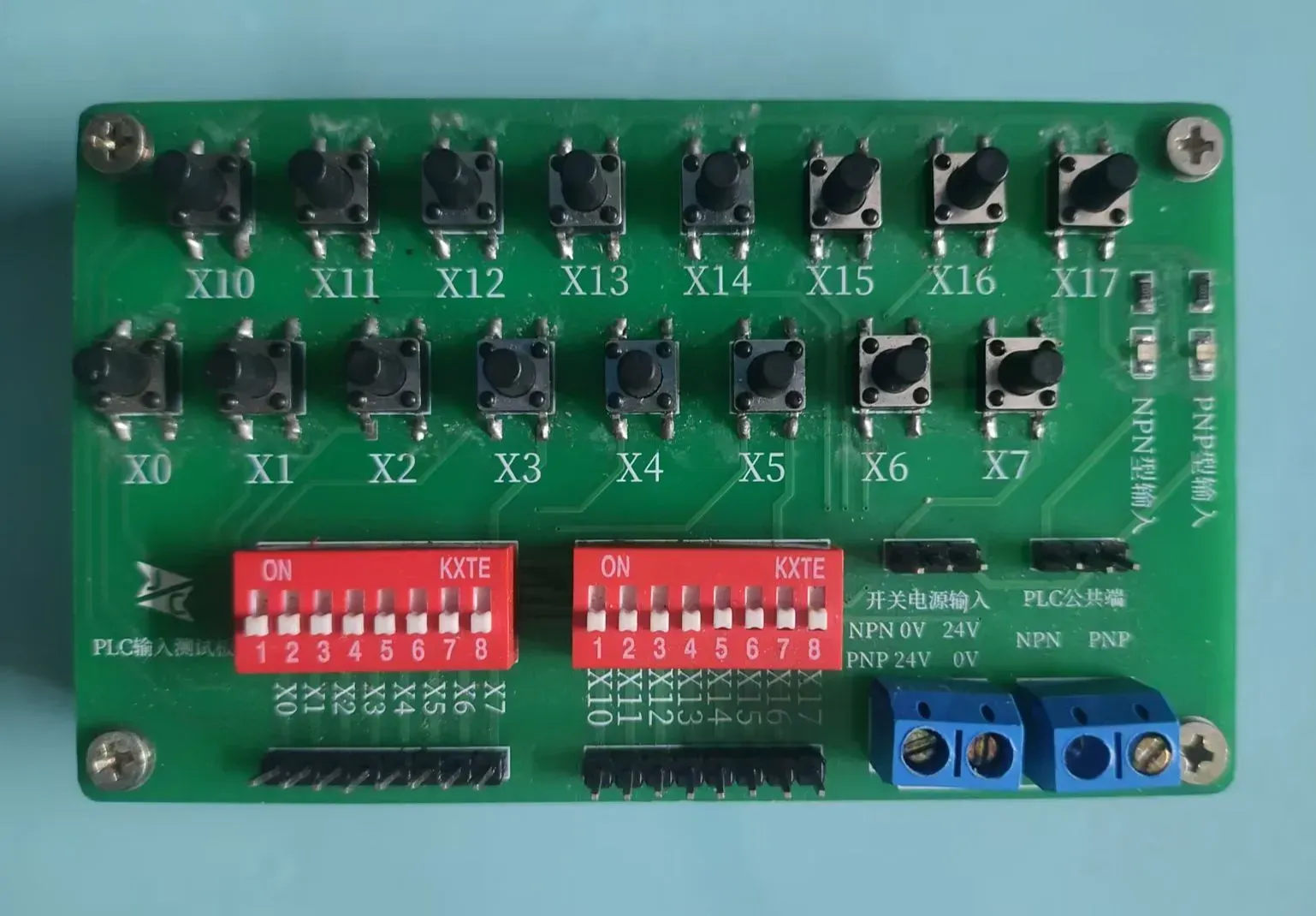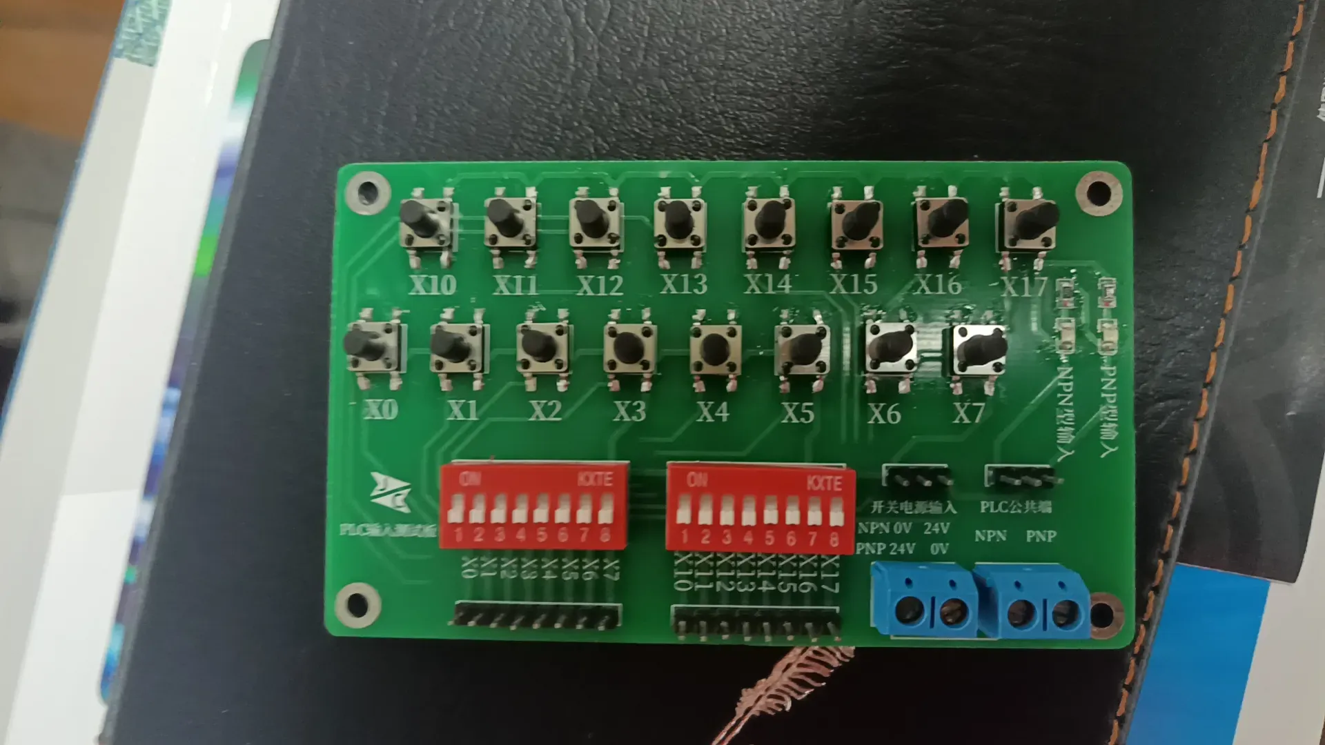 电源的正负极需要根据传感器类型进行选择,有NPN和PNP两种(两种输入都有对应的led灯),需要根据自己的传感器类型进行选择。具体接线可以看一下下面原理图里的说明。目前已经进行打样测试,PLC能够正常识别按键按下。具体的实物图如下图2所示。