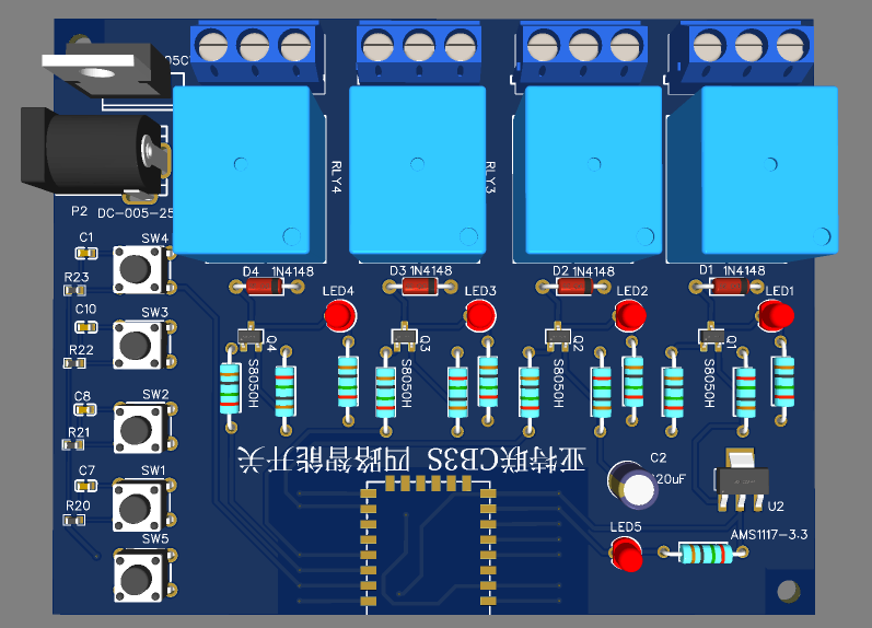 供电:7V-20V直流电源供电,经过78L05进行5V稳压。(为啥要稳压5V?因为要给5V继电器供电。也可以直接5V输入,省去78L05)再使用AMS1117-3.3 LOD进行降压稳压,给主控CB3S智能模块供电。