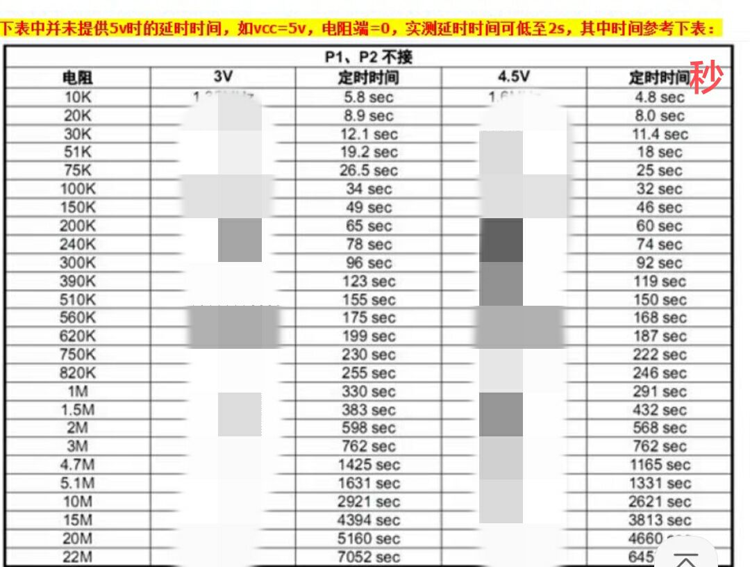 下面是芯片各阻值对应的延时时间,短接P1 P2翻倍时间。
