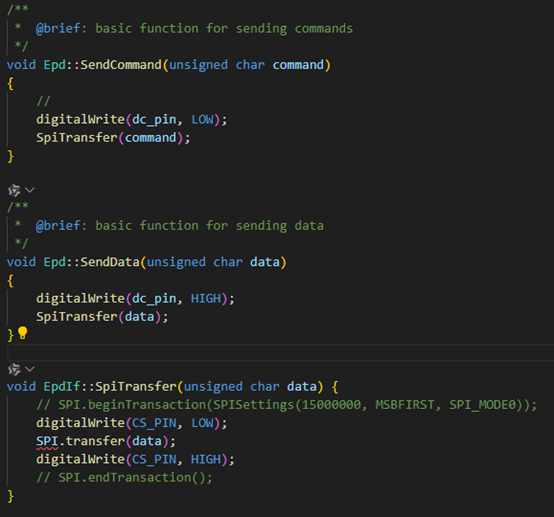 一般卖家会提供软件SPI的驱动方式(程序中翻转IO口来实现SPI时序)所以本文不介绍,以下为SPI硬驱动示例,为了方便截屏放在了一起,实际使用时不需要(删除)继承标志(Epd::/EpdIf),或者按照自己程序需求使用