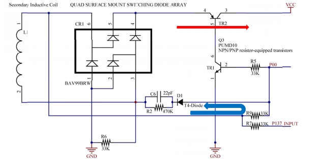 充电控制电路主要由电磁感应次级线圈、全桥整流二极管及三极管开关控制电路组成。