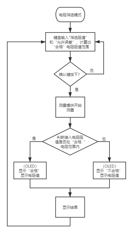 该功能的作用是进行电阻筛选。首先通过键盘输入的筛选阻值和允许误差,计算出合格电阻阻值范围;然后通过调用电阻测量模块,测量对被测电阻阻值进行测量;最后将测量电阻与用户键盘输入阻值及误差范围进行比较判断,将判断结果进行实时显示及语音播报。