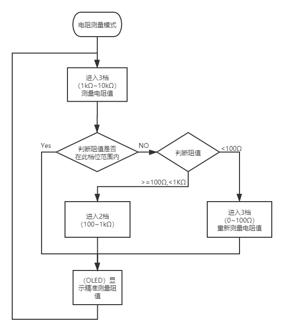 该功能程序的主要功能是通过对相应继电器操作,实现测量量程的自动切换。首先仪器置于中间档位对待测电阻进行粗略测量,根据粗测值进行通道切换,再进行精确测量,其流程如图6所示。