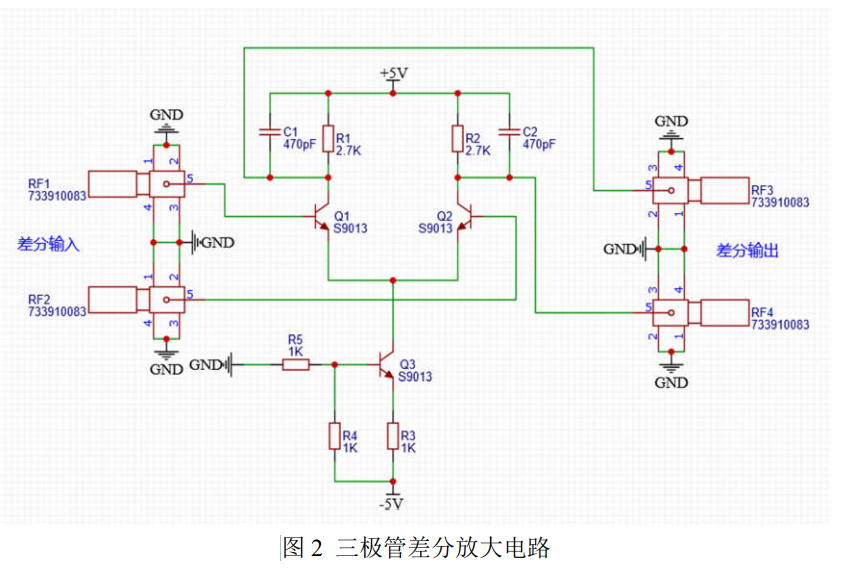 (1)按图 2 所示电路搭建三极管差分放大电路,并调试使之正 常工作。晶体管使用 9013。(