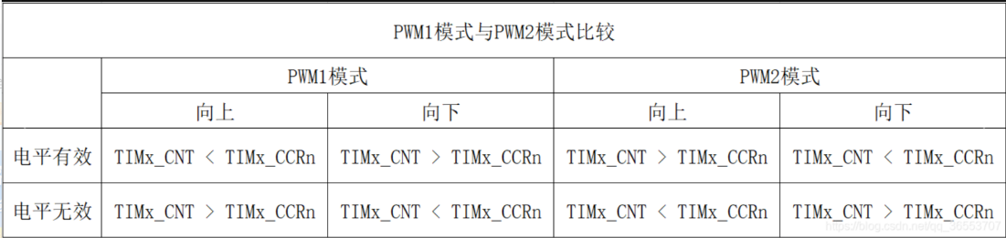 下面是 PWM1 模式与 PWM2 模式的比较表格图,能够比较直观的反映出两者的区别。