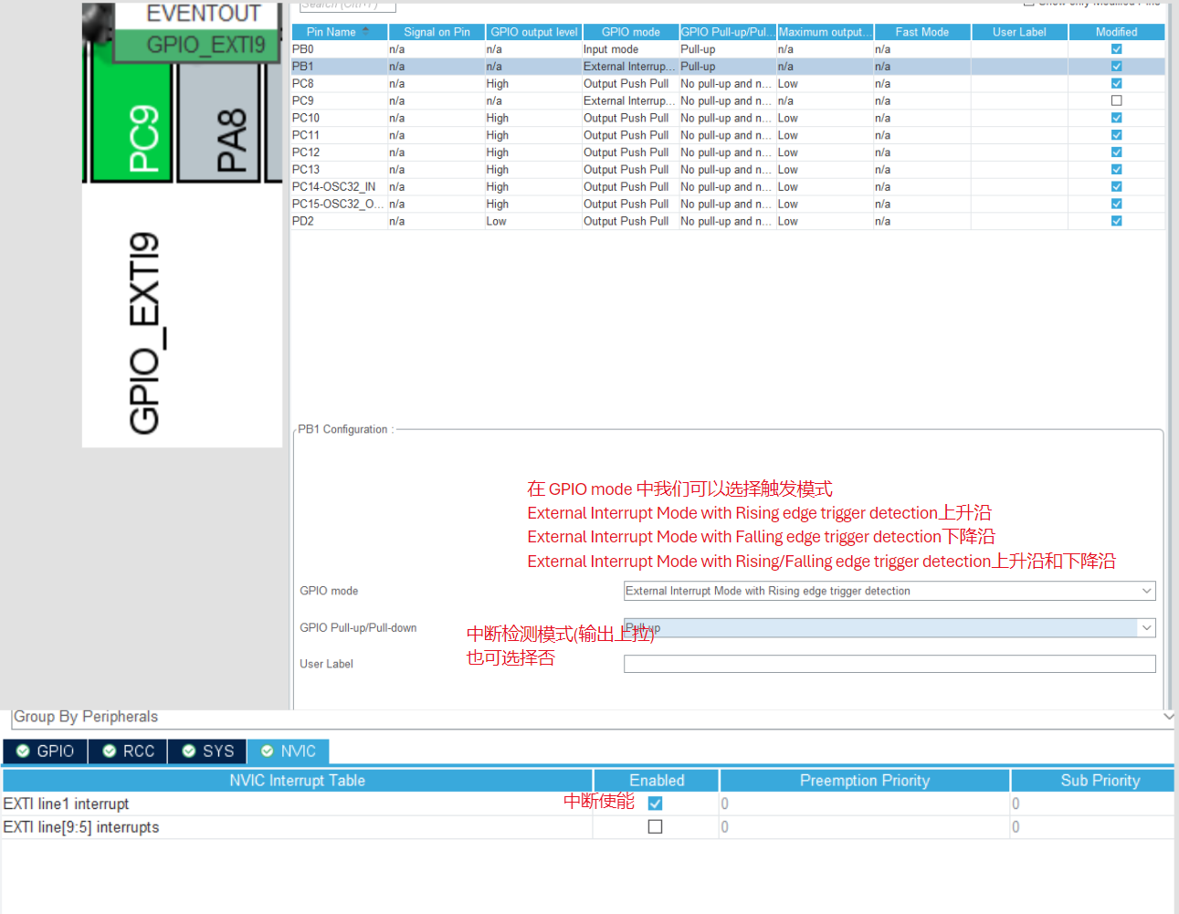 EXTI_InitTypeDef EXTI_InitStructure; EXTI_InitStructure.EXTI_Line=EXTI_Line0 | EXTI_Line1;//配置中断线 EXTI_InitStructure.EXTI_LineCmd=ENABLE;//开启或关闭中断 EXTI_InitStructure.EXTI_Mode=EXTI_Mode_Interrupt;//定义中断模式 EXTI_InitStructure.EXTI_Trigger=EXTI_Trigger_Rising;//触发中断方式,选择上升沿触发 EXTI_Init(&EXTI_InitStructure);