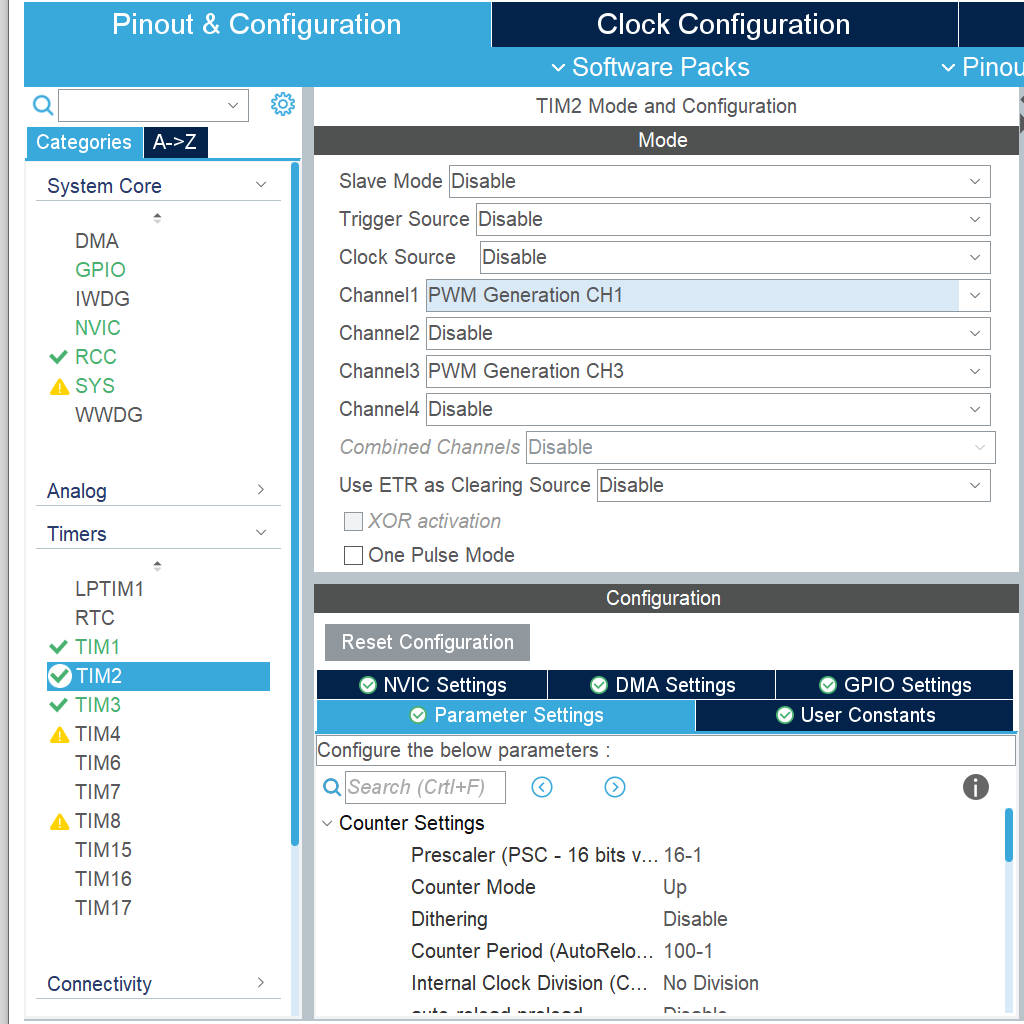 TIM2->CCR1 = (常数/定时器计数值或定时器溢出值)//控制 tim2 1通道输出pwm占空比