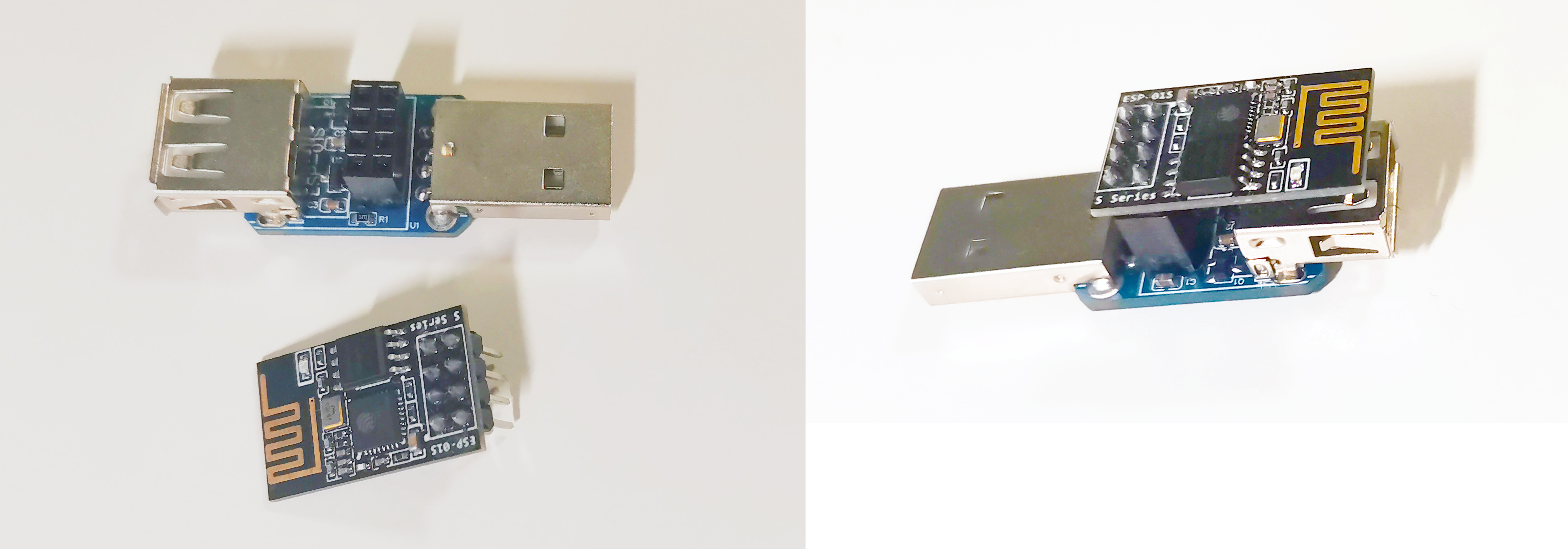 USB公口为输入端,USB母口为输出端,2×4pin母座用来连接ESP-01S模组(务必注意模组方向应朝着USB母口一侧 )。