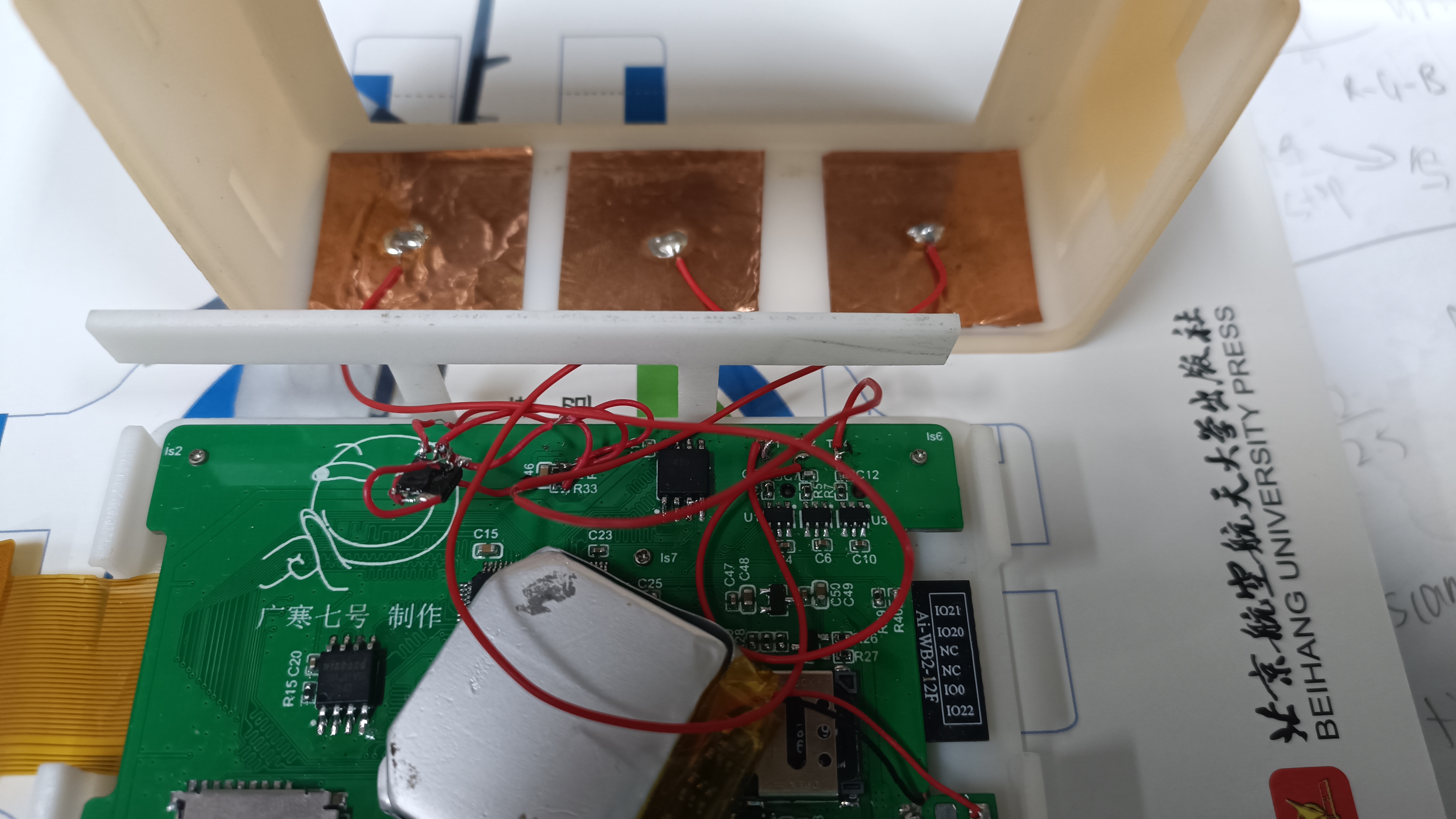 5. 在外壳顶部贴上3片铜箔胶带,引线焊接到PCB电池座背面的3个测试点上,中间线从后壳屏幕支撑架中穿过后焊在最左边的点上,剩下两个点与按键相对位置相同。建议引线尽量短以避免线间电容对触摸造成的干扰。电池接口左正右负,中间为NTC检测线的焊接点,如果使用NTC功能需要将R24空焊。