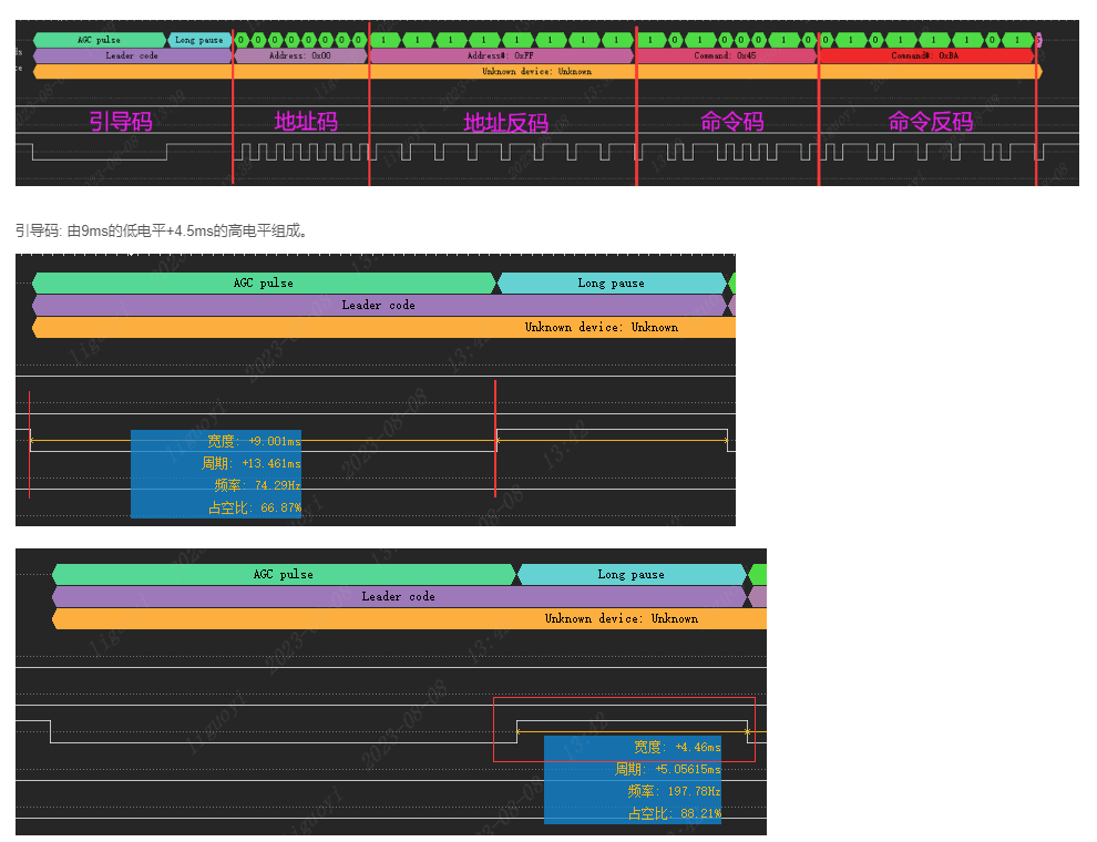 重点: NEC协议传输数据位的时候,0和1的区分是依靠收到的高、低电平的持续时间来进行区分的。这是解码关键。