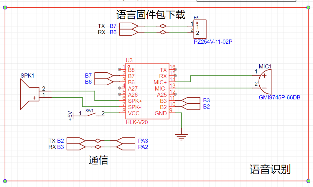 语音识别模块我们配置为了串口通信方式,在原理图中我们接入的是PA2和PA3,它们是串口1的复用引脚。复用通道是AF7。其中PA2是串口1的TX,PA3是串口1的RX
