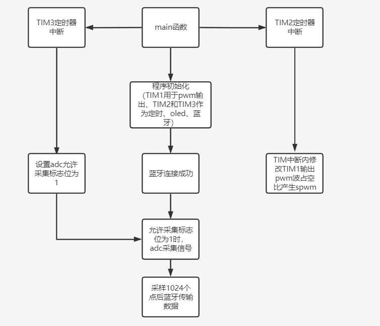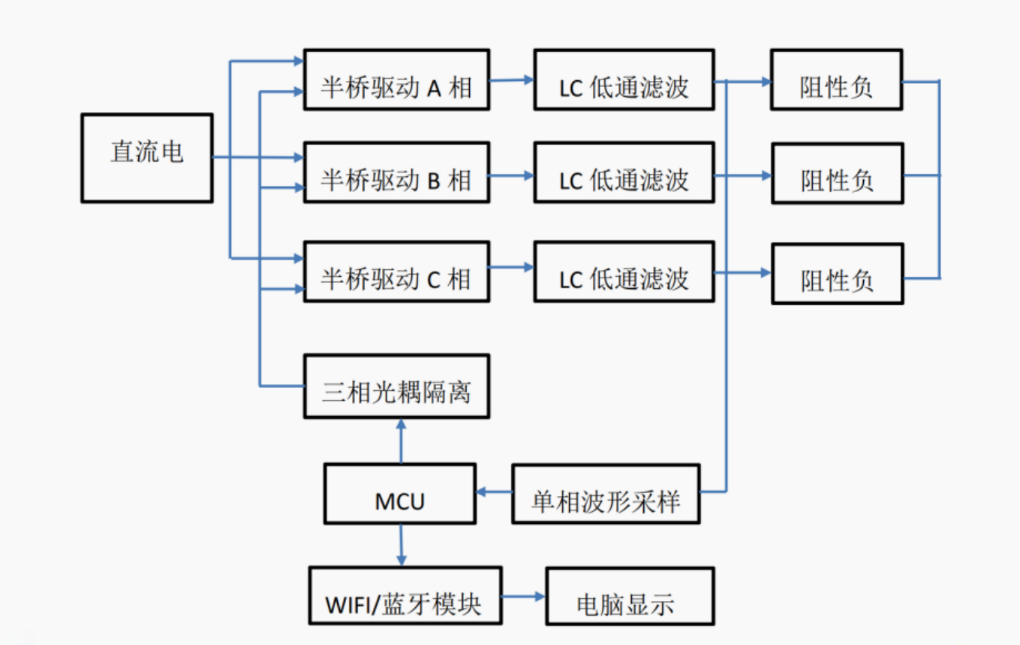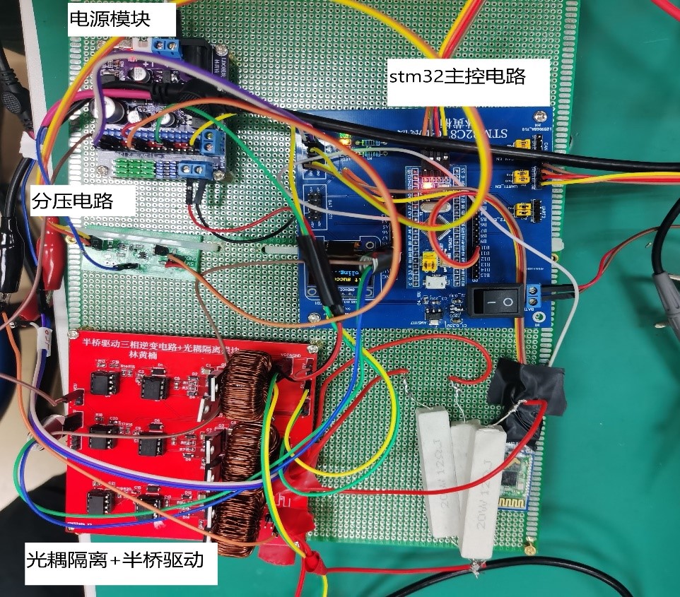 系统以STM32作为主控芯片,产生三相SPWM波并通过半桥驱动电路放大功率,经滤波后产生三相电,再通过STM32采集经前端衰减后的输出电压,通过蓝牙发送给电脑端上位机接收数据MATLAB进行谐波分析。