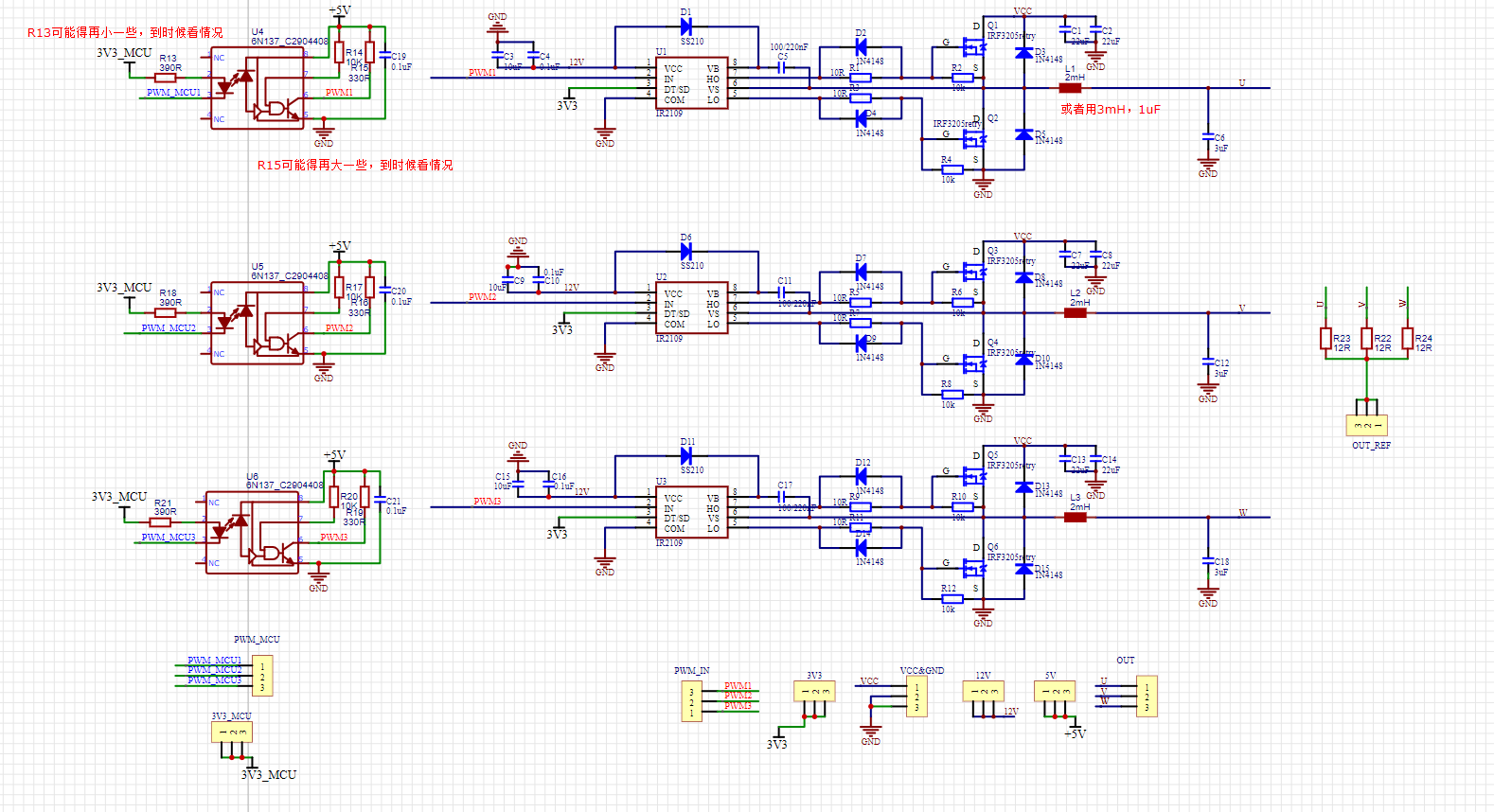 (4) 光耦隔离+半桥驱动模块:左下角光耦隔离+半桥驱动模块提供spwm波控制对直流电压进行逆变