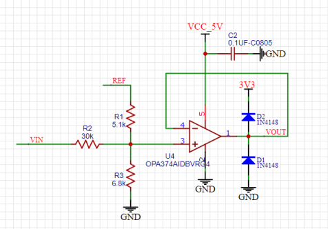 然后通过电阻网络分压和电压跟随器把电压转换到0-3.3V之内。