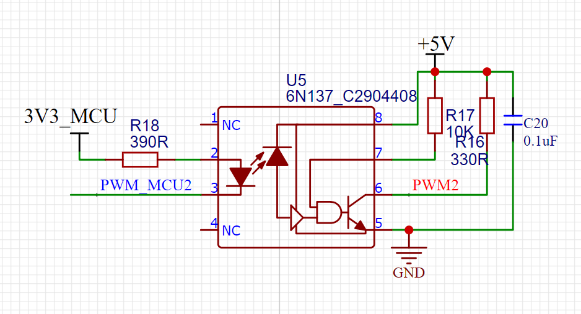 该驱动电路采用高速光耦隔离模块6N137连接单片机和驱动电路,该光耦模块以光信号为媒介来实现电信号的耦合与传递,输入与输出在电气上完全隔离,具有抗干扰性能强的特点。对于既包括弱电控制部分,又包括强电控制部分的工业应用测控系统,采用光耦隔离可以很好地实现弱电和强电的隔离,达到抗干扰目的,电路具体原理图如下: