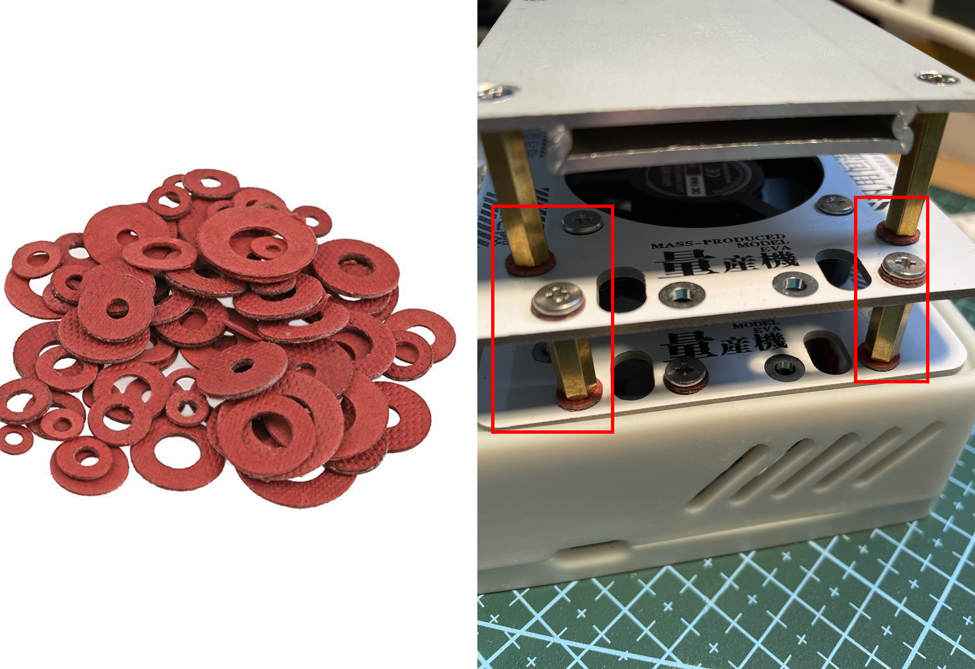 考虑到外壳是树脂材料,耐受温度只有50度左右,所以在每个铜柱和pcb板子连接的地方垫上了红钢纸绝缘垫圈。