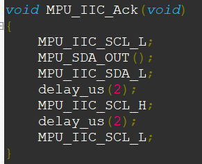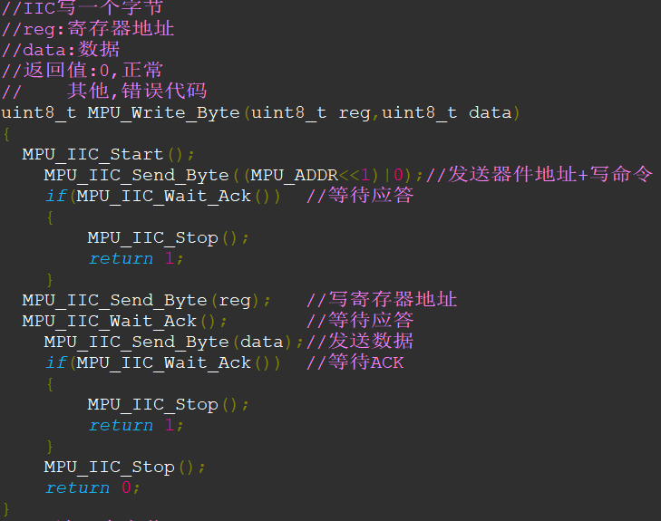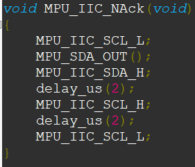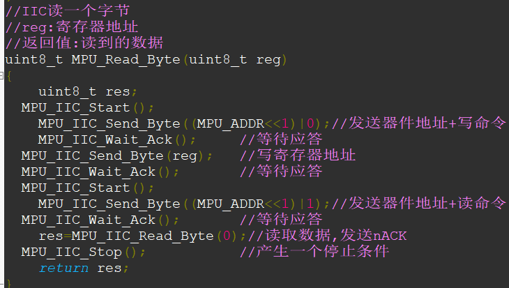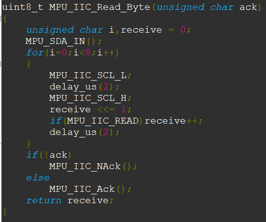 如图7此函数描述了如何从SDA引脚读取8位数据,与IIC的发送8为数据类似,都是需要循环8次;区别在(1)需要提前MPU_SDA_IN();也就是将SDA引脚设置为输入,(2)需要定义一个8位局部变量每读一位数据向左偏移一位以存储起来,循环8次正好储存一整字节,(3)在接收完一个字节后,不论是不是接收到了正确的数据,一定得发送是否应答的信号。