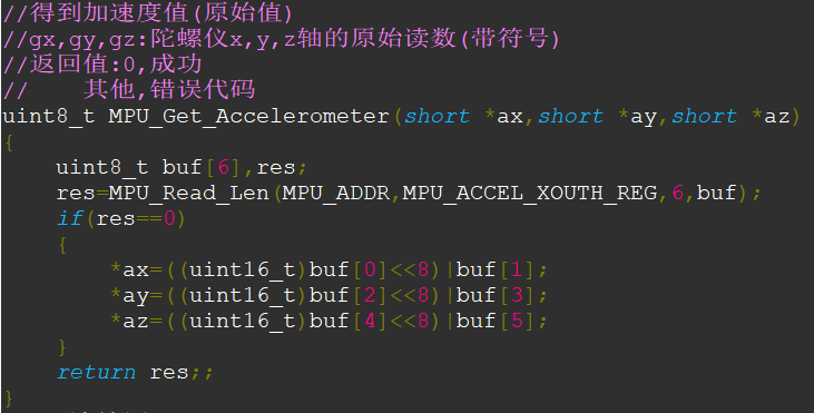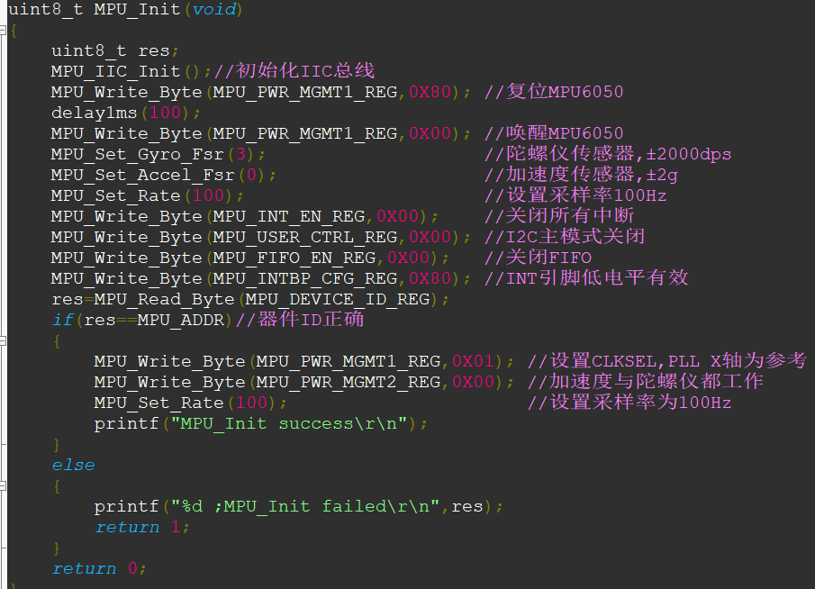 图9此两个函数是融入了MPU6050的特性的,从这里就可以看出MPU与OLED使用IIC的不同,OLED发送8位数据0X78,0X00,0X40分别代表OLED的地址,即将写入命令,即将写入数据三种意思;MPU则是((MPU_ADDR<<1)|0),((MPU_ADDR<<1)|1)分别代表写命令和读数据,两者使用IIC的区别一目了然且都完美符合IIC协议;在进行完上面的操作后,就是对设备的相应寄存器进行设置,设置好后就可以读数据了。