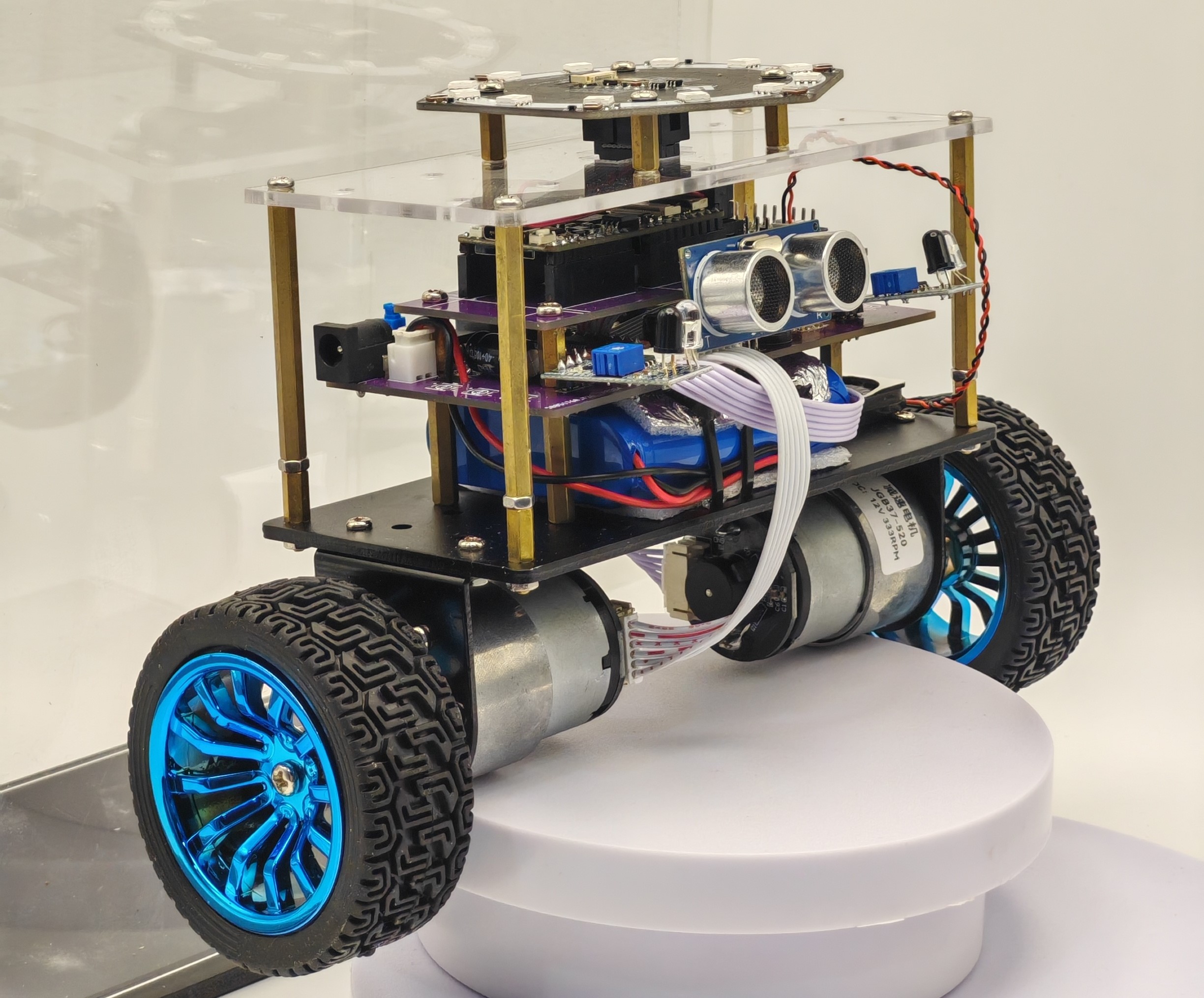 重新拆开优化结构使两轮子轴心一致,高度尽可能小降低重心,定制个亚克力外壳,将外露的导线理顺更加的美观。