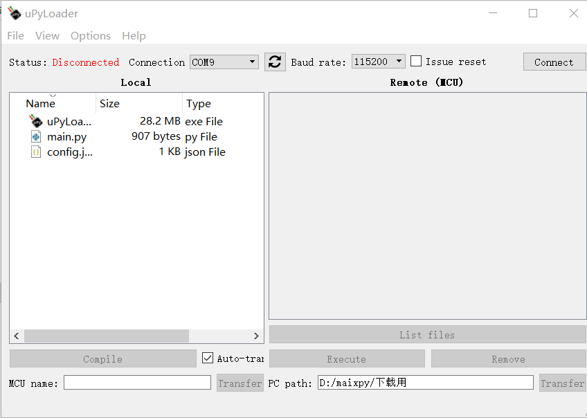 3.使用下载软件uPyLoader将固件中的main.py替换成我们所写的main.py(由声源定位改名而来),就可以使开机直接执行我们所修改的程序。