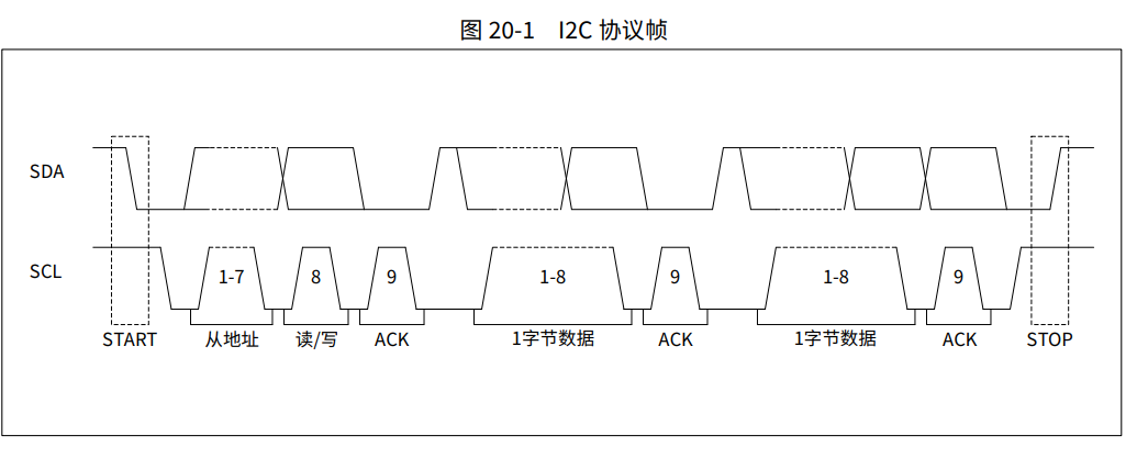 图1这个结构描述了IIC通讯时的基本结构,包含起始位,8位数据,应答位,结束位;此结构也是IIC发送一个8位数据时需要遵循的结构,这也是IIC的特性;我们需要的是使用我们的GPIO通过置1置0以及延时来模拟此IIC的结构,也就是起始位,8位数据,应答位,结束位。