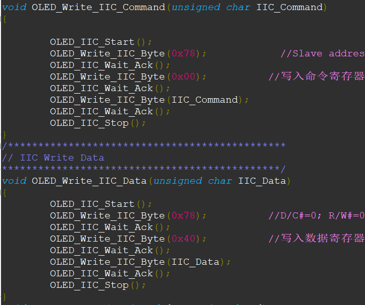 前面说了此屏幕想让它显示我们要显示的数据,需通过IIC协议向其发送命令设置好寄存器,再通过发送数据对OLED的显存进行操作也就是让相应的像素点点亮就行了;