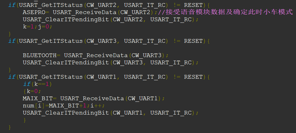 2.先由三个串口接收函数来确定小车此时的模式,由于使用接收标志位来判断是否有新数据所以标志位就不会被随意误刷新: