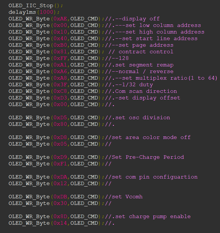 如图4:上面我们说过使用发送命令函数对一些相应的寄存器进行设置后,再使用发送数据函数就对显存进行操作就行,在我们使用GPIO模拟出了起始位,8位数据,应答位,结束位后,也封装出了发送命令函数和发送数据函数;现在使用发送命令的函数向OLED的寄存器进行一些设置,具体要设置啥得自己翻译去,网上找找肯定也有中文注释,大概就是设置一些像范围,是否反向显示等等;进行完这一步后,就来到了最终的发送数据来显示我们想要的’1‘了。