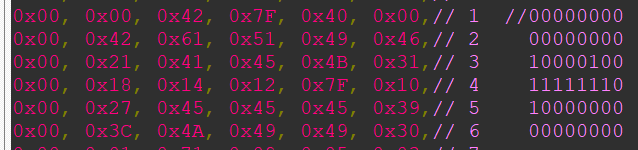 就像这个0x00, 0x00, 0x42, 0x7F, 0x40, 0x00,这是OLED认识的’1‘,我们将此6个数据发往OLED那么OLED就会在屏幕上显示为’1‘,中间涉及到一个取模的过程;仔细看看可以看出将此6个字节表达的数据按顺序写成2进制,2进制里所有的’1‘连在一起其实就可以看出里面的数据表达的就是我们人所认识的向右倒地的’1‘。
