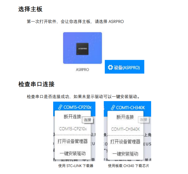 (2)选择主板,检查串口连接:通过ASRPRO的串口0下载程序,PB5是TX,PB6是RX