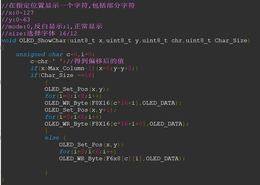 如图5这个函数是把我们想要显示的字符与我们向括号填入的字符联系起来的函数,因为假设我们填入’1‘这个字符进去,OLED是不认识的,我们需要给OLED提供一个字库,F8X16[c*16+i]就描述的是8*16像素点大小的字库,里面描述了0-9分别应该怎么显示,字库包含的数据与我们要显示的数据是一 一对应的,字库就是OLED的语言,’1‘属于我们人类的语言。