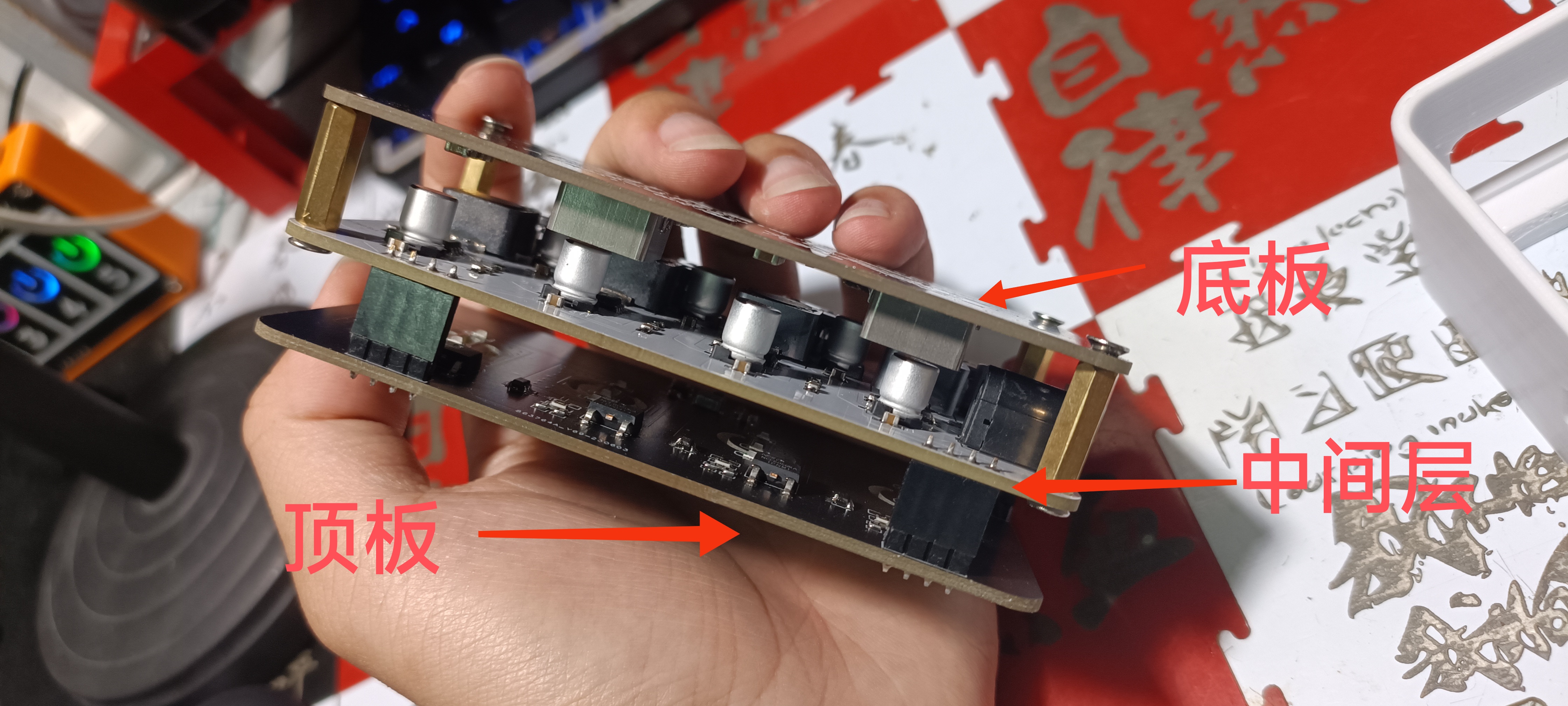 2,中间层和底板采用 M3X15 双通螺丝连接,注意螺母不但负责固定还有电源连接,螺母带电,安装上下层不要装反否则会烧毁。