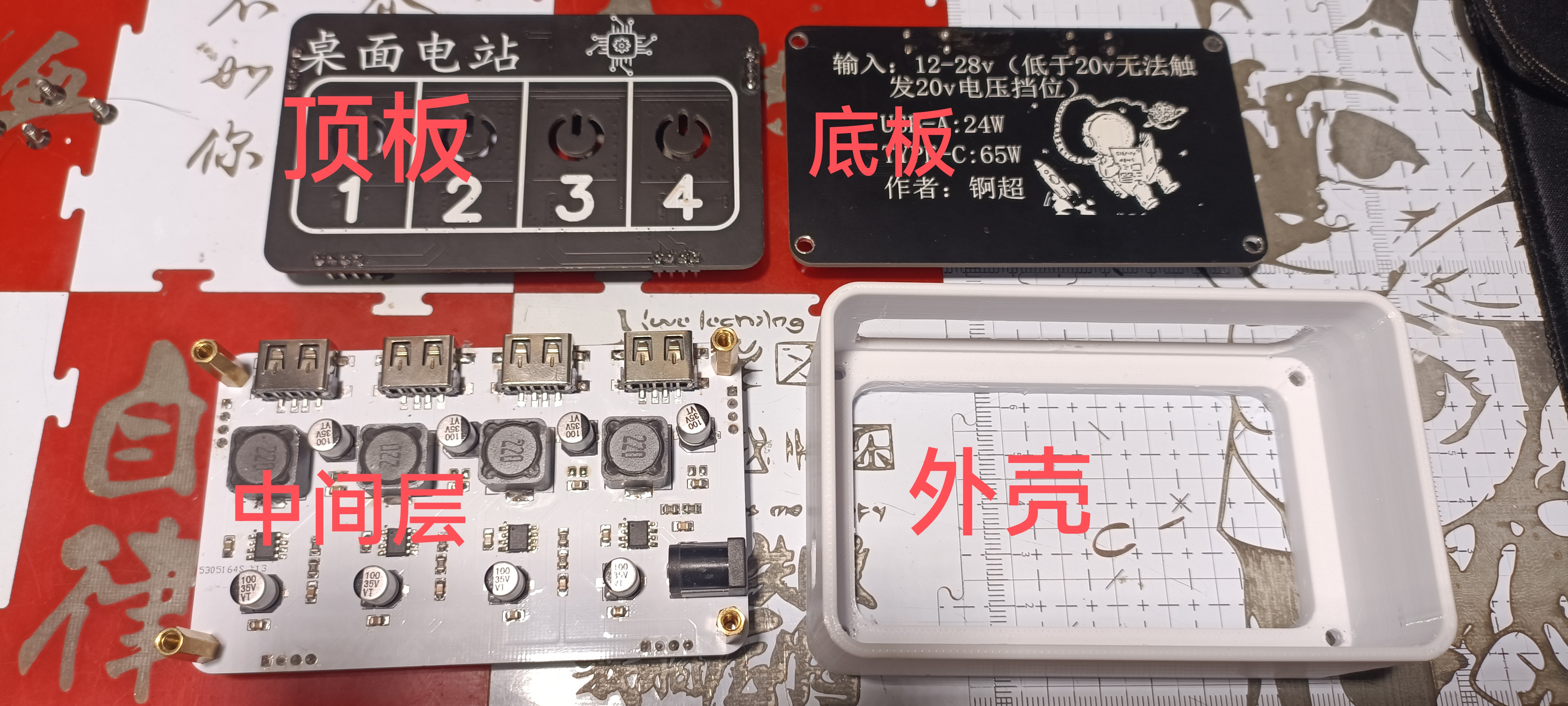 大功率触控桌充,4个 24w USB-A可控制接口 + 2个65w Type-c 输入电压12V-28V,低于20V无法触发20v充电档位,DC电源输入接口. 采用3层CB叠加设计,外加3D打印外壳。