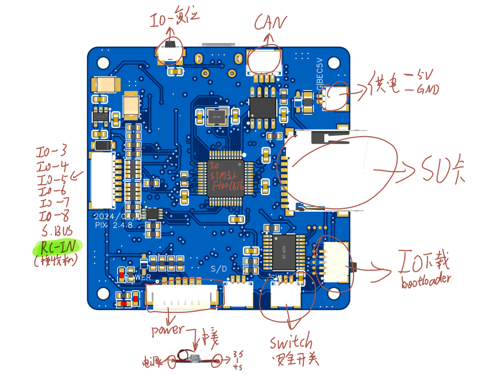 - 本模块是飞控的控制板,里面所有端口全部引出,可二次开发,实现低成本无人机。