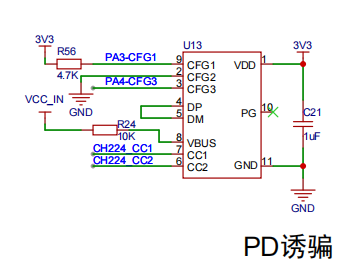 CH224K PD电源诱骗,通过MCU配置可选5V /9V /12V 三档电压。