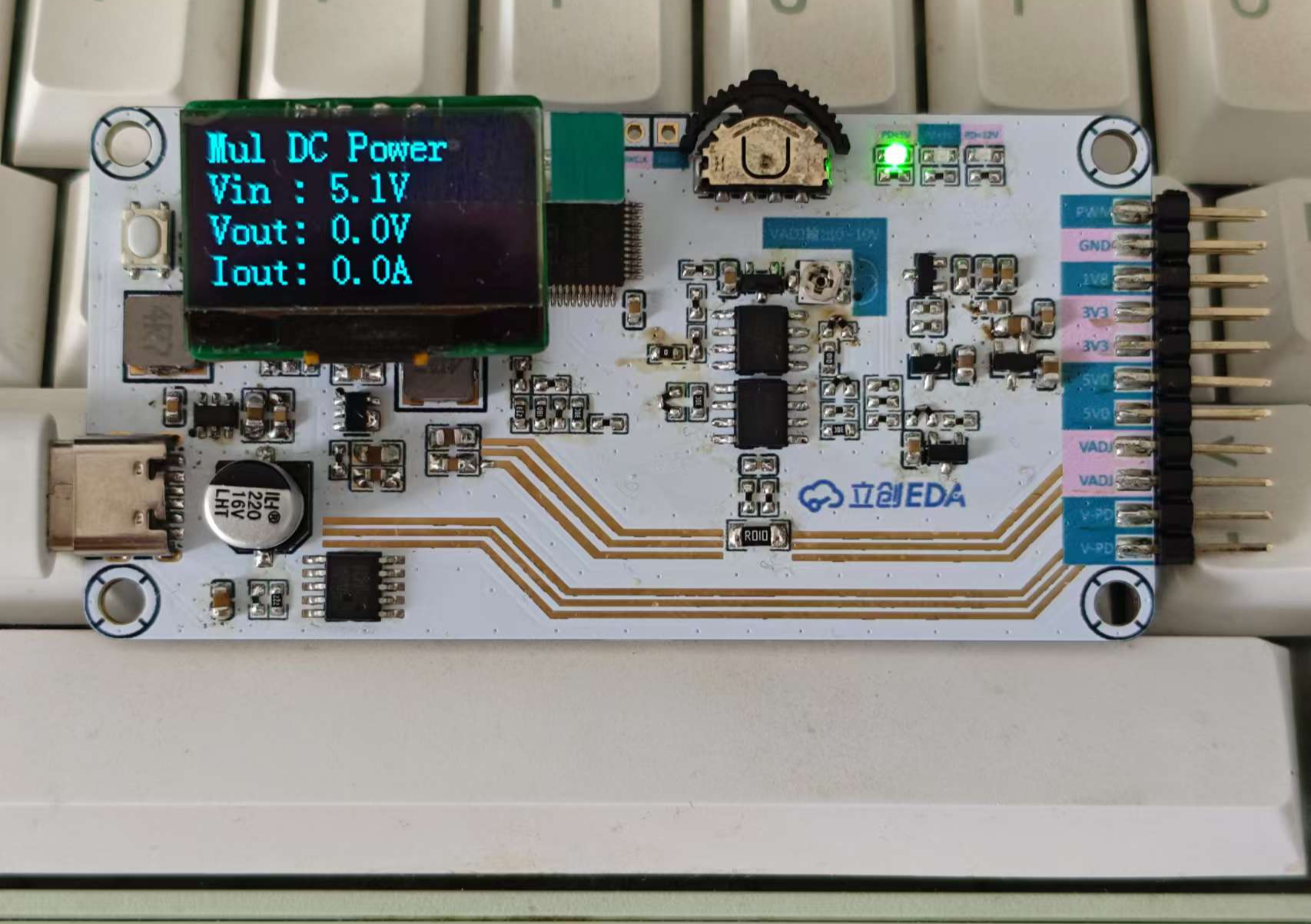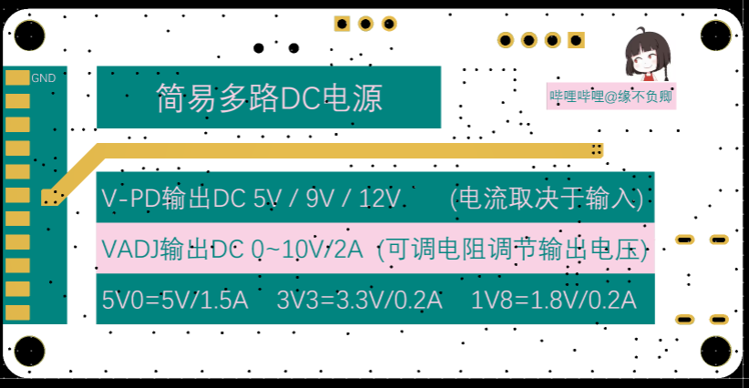 1路 PD电平直出,支持5V/9V/12V三档,自带PD诱骗,最大电流取决于输入适配器供电能力。(一般20W的PD适配器为5V/3A,9V/2.22A,12V/1.67A)