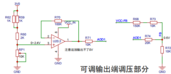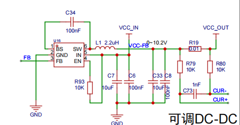 DC-DC降压部分,通过可调电阻控制FB电压调整输出电压范围。