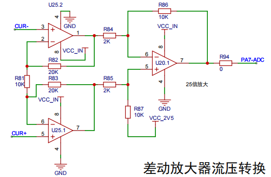差分放大电路用于采集输出电流,通过ADC采集放大后的电压信号,精度0.1A。