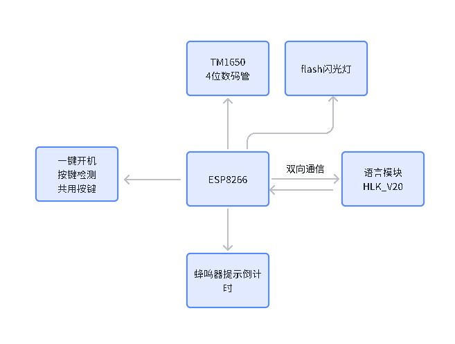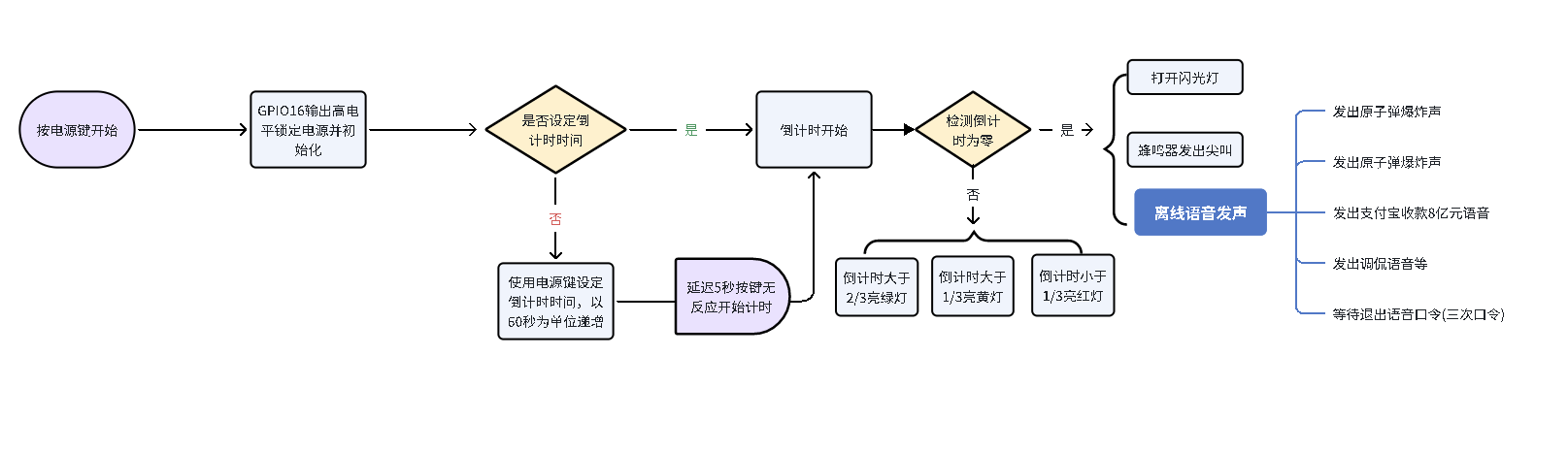 倒计时分为三段:倒计时大于2/3,ws2812显绿灯(代表倒计时时间还长),大于1/3显示黄灯,小于1/3显示红灯,倒计时结束,发出两声原子了炸声,并发出收到支付宝收款的声音,在数码管显示BBBB时,需要根据语音提示说出三次口令才能退出语音,关闭电源,或者继续循环播放以上语音。