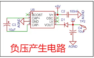 一,电源部分:由于立创·GD32E230C8T6开发板已自代有5V转3.3V电源,所以并没有在底板上设计5V转3.3V电源模块(有兴趣可以参考立创·GD32E230C8T6开发板原理图上的电源),只在底板上加入了-5V电源,使用ICL7660来进行5V转-5V,